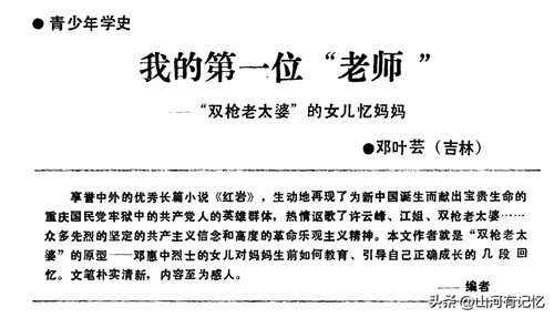 1990年,邓叶芸在《党史纵横》第4期,发表了《我的第一位“老师”——“双枪老太婆”的女儿忆妈妈》一文,缅怀亲爱的母亲。
