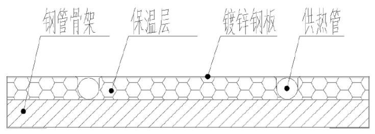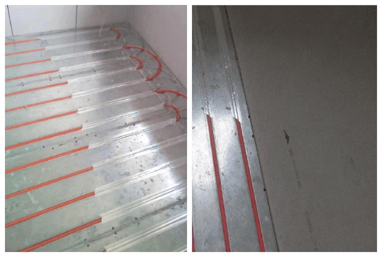 1)将地暖供热管埋设于条形暖管槽和弧形暖管槽中,然后用铝箔胶带进行封粘。地暖供热管间距 150mm;2)地暖管埋设完毕后,在地暖模块上涂敷结构胶,将多个硅酸钙板以拼接的方式粘接在地暖模块上,并且相邻的两个硅酸钙板的边缘之间留出 3mm 缝隙,压紧硅酸铫板直到其与地暖模块粘接牢固。