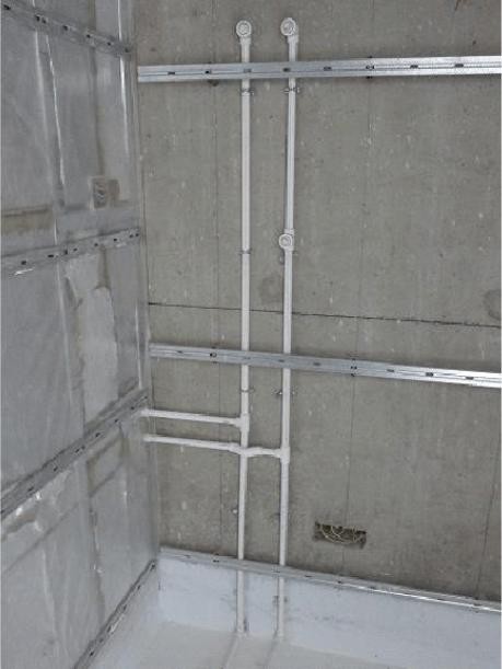 1)隔墙龙骨框架、卫生间防水涂料完成后,方可进行施工;2)内丝弯头安装时突出于涂装板墙面 5mm,用玻璃胶对边口进行封闭,以防漏水时水流入涂装板内;3)水平管道延地面铺设,穿行于地面架空层内,最终接于公共区域管道井内水表后;4)管道不得穿越隔墙,与其他管路交叉时,采用过桥管件进行连接。其中:给水管采用PPR20管白色,中水管采用PPR20管绿色。