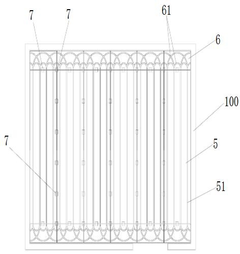 5第一地暖模块 51条形暖管槽 6第二地暖模块 61弧形暖管槽 7地脚组件 100墙面