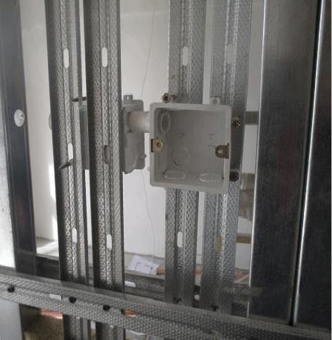 1)在间距 400mm 的两根竖向龙骨之间,安装横向龙骨,PVC接线盒固定于横向龙骨上,PVC管用管卡固定牢固;2)卫生间内PVC接线盒安装时与涂装板墙面平,用玻璃胶对边口进行封闭,以防水汽进入涂装板内;3)采用PVC接线盒与结构预埋管路进行连接,穿线时接地线用压线端子与既有预埋管路进行固定,裸露线头用包塑软管进行保护;4)电线管路接于户内强、弱电箱内。其中:电线管采用PVC20管,接线盒采用 PVC86盒。