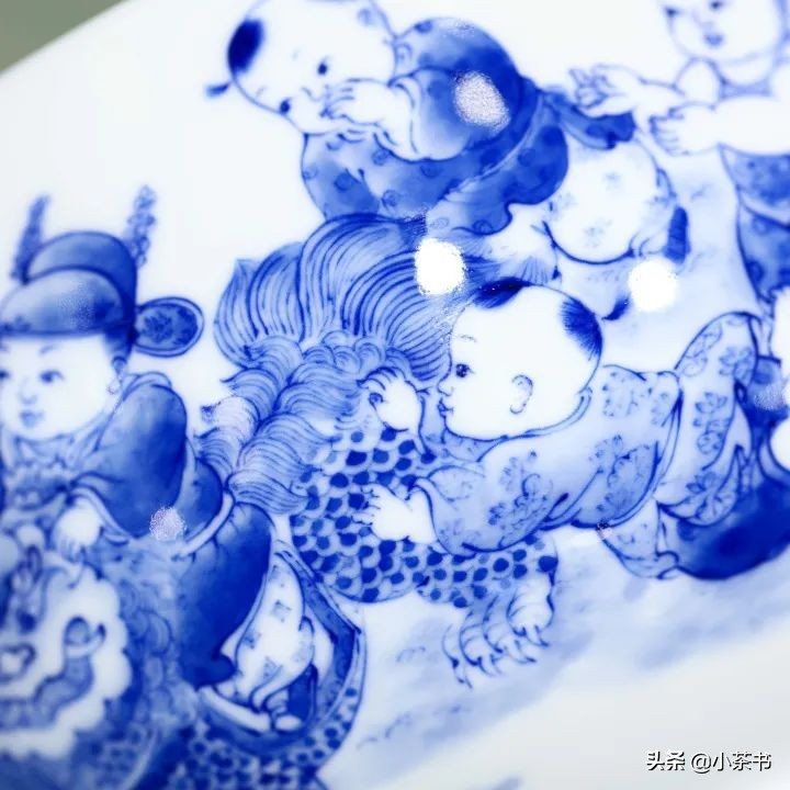 段夫人回忆说:“九段人物题材茶器最早定价500元一只,2008年10月份试烧,2009年就开始走向市场。”同年首创的大头娃娃婴戏题材走俏市场,九段的婴戏因喜庆圆润的开脸和天真无邪的身姿神态被业内称为段家娃。念起做婴戏的缘由,段夫人笑说“当时是因为果果(孙女)出生了嚒,段老师是明显带着喜悦的心情比照着去画的。一直以来,景德镇婴戏纹饰以仿古画为主,小孩子都是带着老气的。而我们就是要活泼的画风,去体现小孩游戏、玩乐时的自由自在与天真浪漫,真实体现我们小时候无忧无虑的心情和神态。包括今年新出婴戏纹饰里的滑滑梯和吹泡泡,都是融入现代人的生活元素用古代的衣服去体现的。”