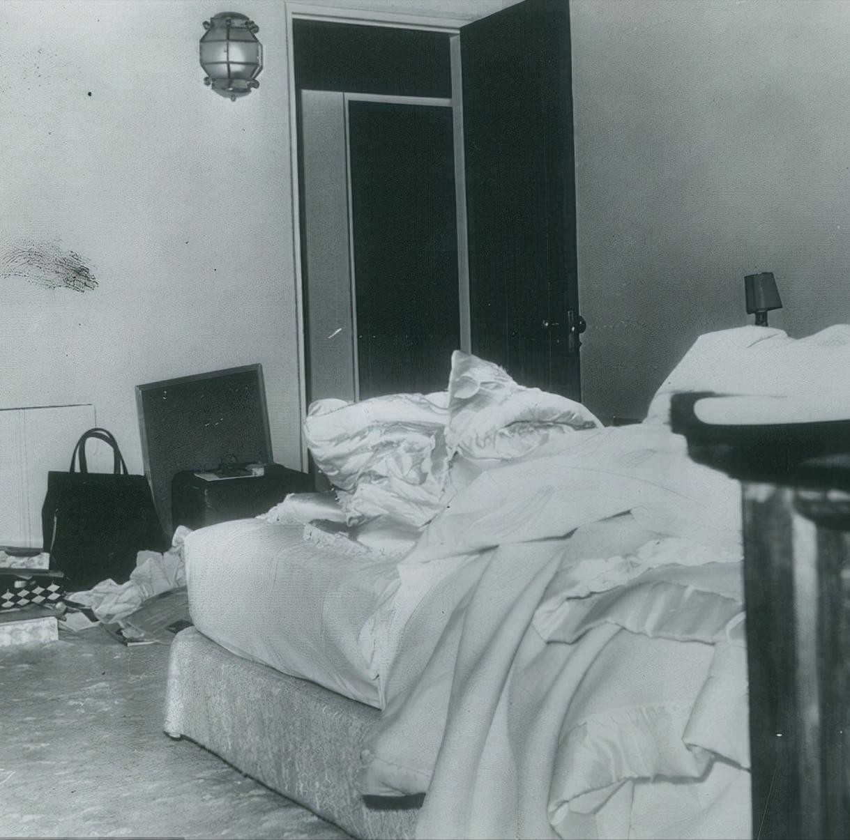 这张由独家获得的警方照片显示,玛丽莲卧室的墙上可能有血迹。