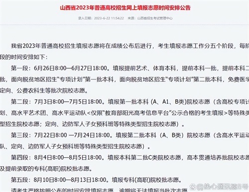 6月29日至6月30日:高校专项计划、高水平艺术团、高水平运动队招生合格考生,普通类第一段等志愿填报同时进行;已填报志愿但又放弃录取的考生,只能参加普通类第二段及之后录取。
