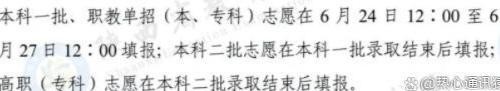 7月24日-26日填报:普通类、体育类常规批第2次志愿;艺术类专科批第1次志愿:春季高考专科批(含技能拔尖人才)第1次志愿。