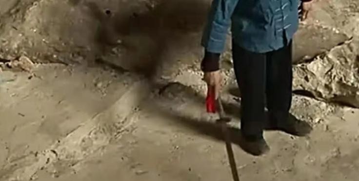 将死者的棺材合棺后,背尸人即将要用刀指地,