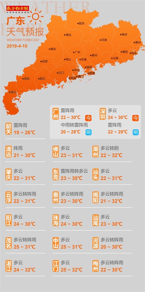 明后天(11-12日),受冷空气和切变线影响,粤北、珠江三角洲和粤西北部市县有中到大雨局部暴雨,其余市县有(雷)阵雨,局部大雨;雷雨时局地伴有强降水和8级左右短时大风。粤北日平均气温下降4℃~6℃,粤西的南部市县下降1℃~3℃,其余市县下降3℃~5℃。