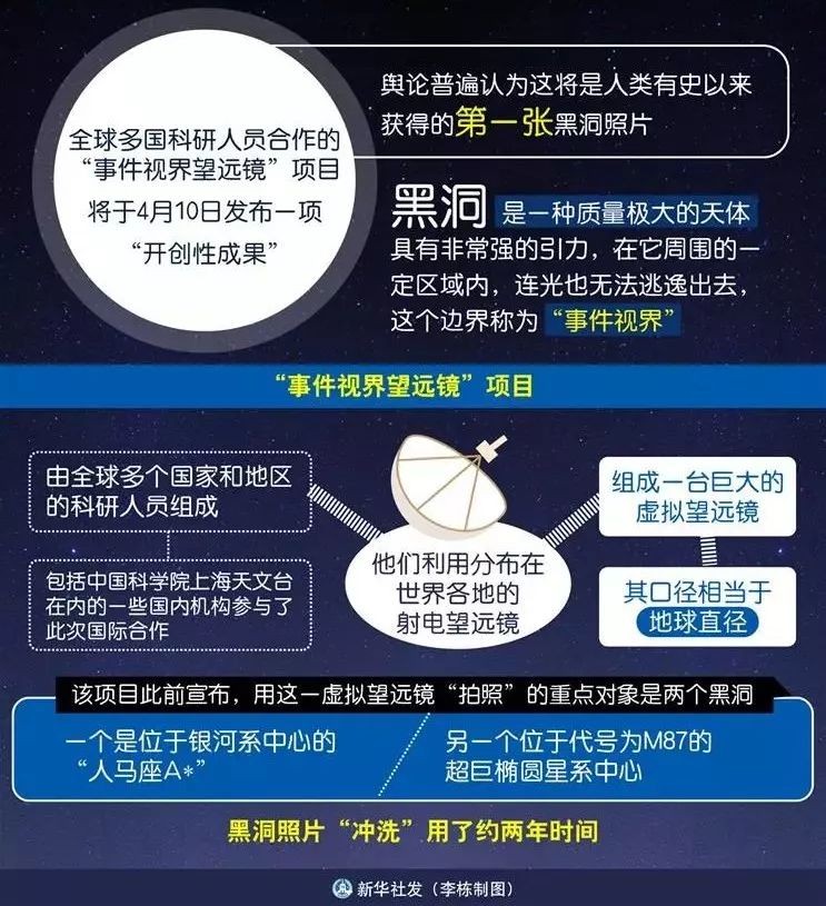 全球多国科研人员合作的“事件视界望远镜”项目将于10日发布一项“开创性成果”,舆论普遍认为这将是人类有史以来获得的第一张黑洞照片。2017年4月“事件视界望远镜”启动拍照,黑洞照片“冲洗”用了约两年时间。