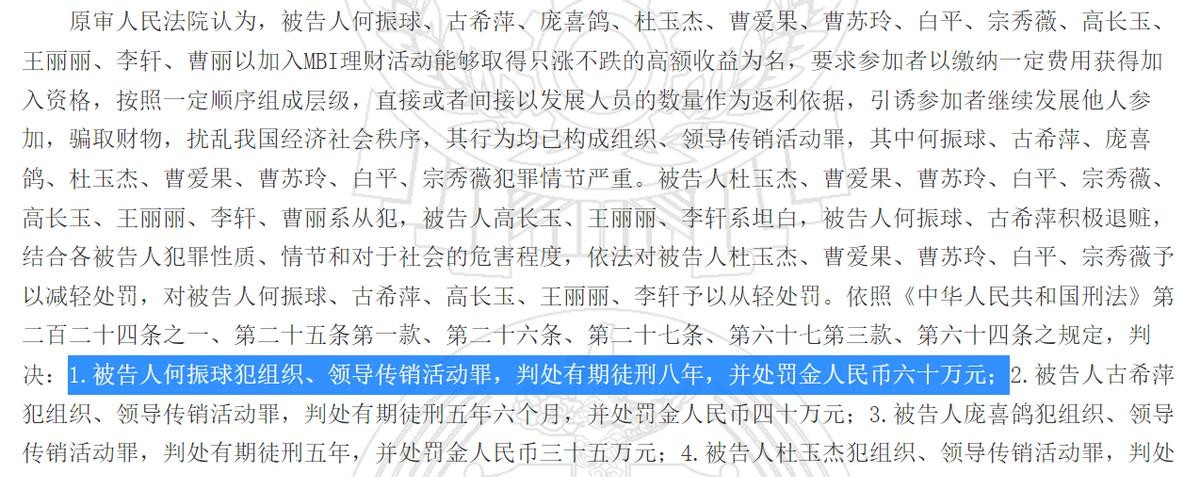 好在国内对于MBI传销的打击还比较早,国内的重点头目何振球等人,在2016年底,就被判了8年,追退回赃款超千万元。