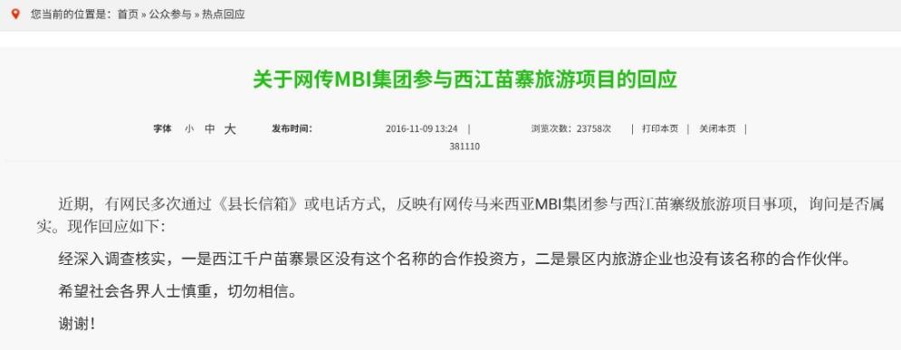 投资人们为了验证也去官方咨询过,雷山县还专程做过回复称,并没有与这家公司有过合作。但MBI私下又是各种借口推脱,类似的比如在合作保密期、合作公司在运作等等诸多理由。