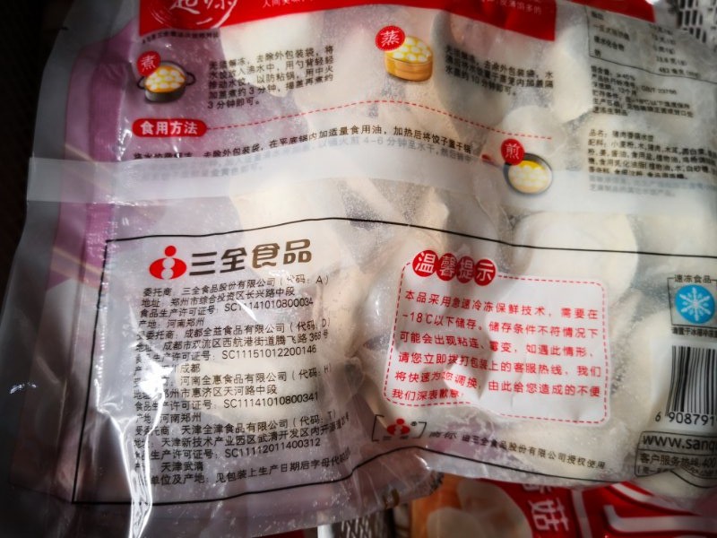 其中,北京多家商超售卖的“三全灌汤水饺”批次为20190108T、20190106T、 20190111T、 20190112T,20180104D,产地为天津和成都;在陕西西安多家超市,“三全灌汤水饺”的批号主要为20181018D、20180929D、20190104D,产地均为四川成都。