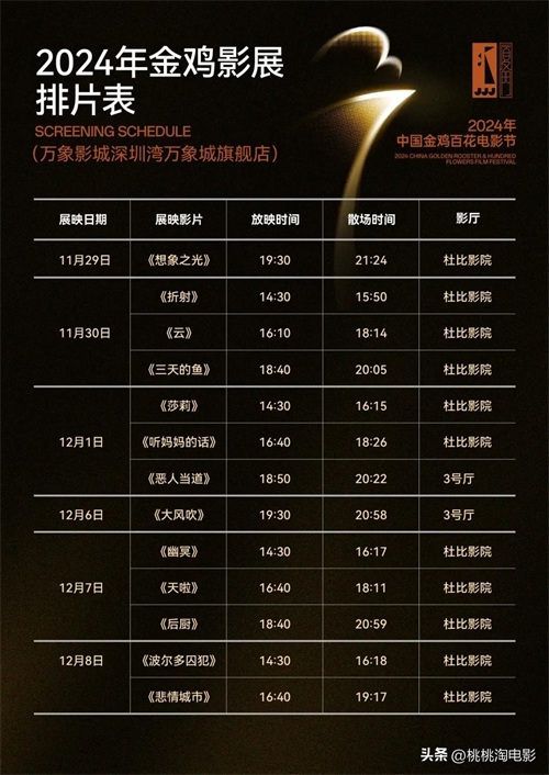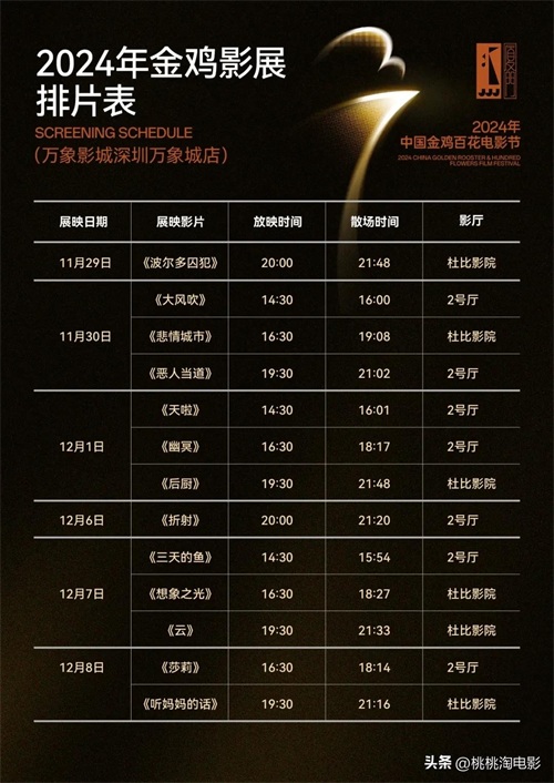 2024年金鸡影展以“大路”为题,携影同行,集结了70余部佳作,多为中国首映或亚洲首映,在金鸡奖颁奖典礼圆满落幕之际,金鸡影展将继续上路,于11月29日至12月22日在苏州、深圳、北京、成都展开巡展。