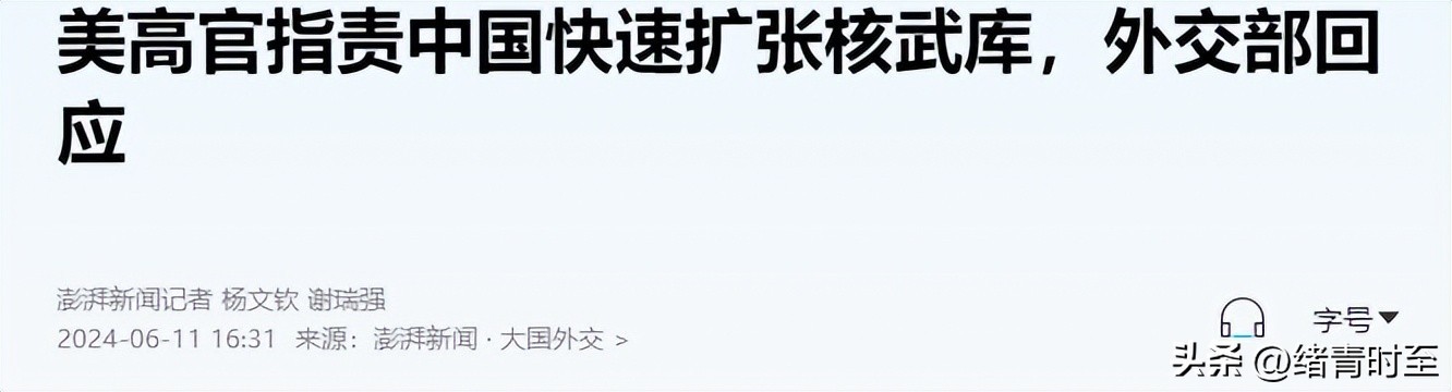 信息来源:澎湃新闻 2024-6-11 《美高官指责中国快速扩张核武库,外交部回应》