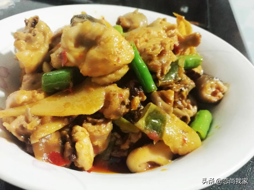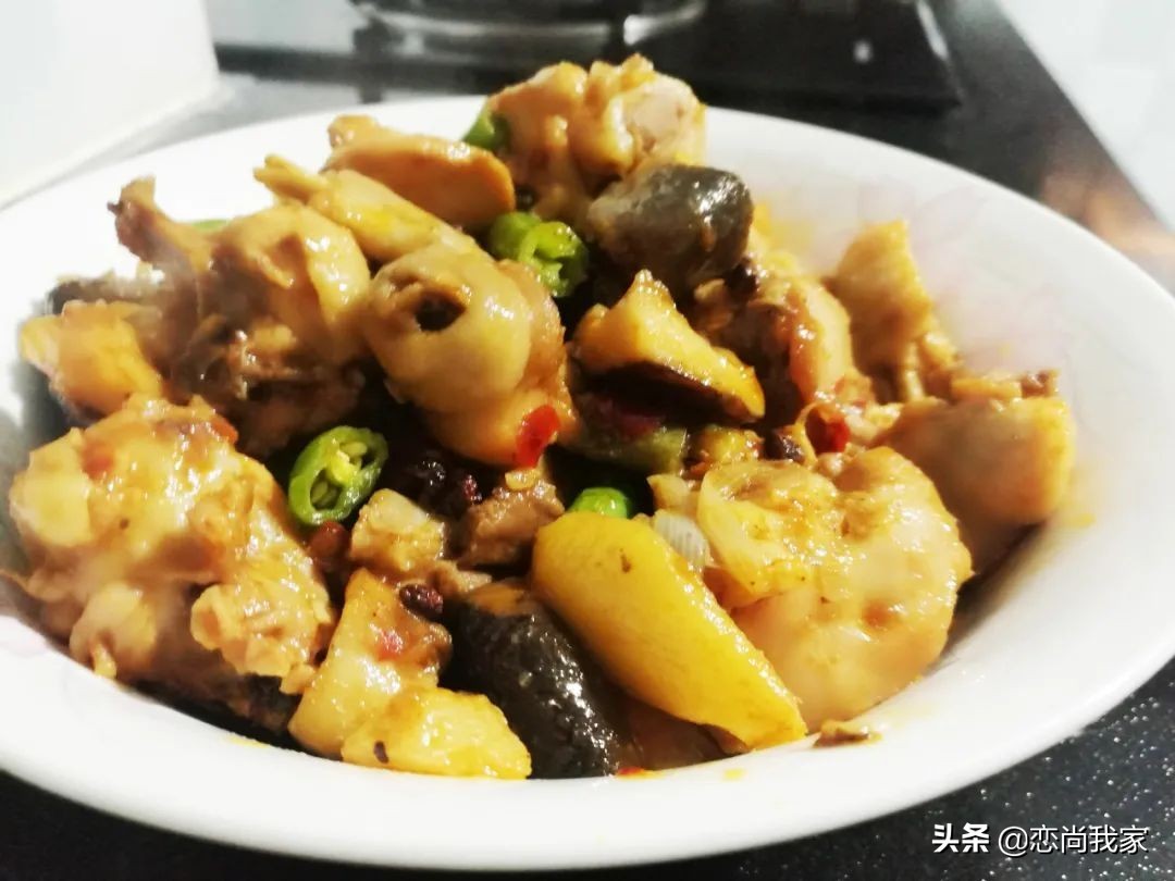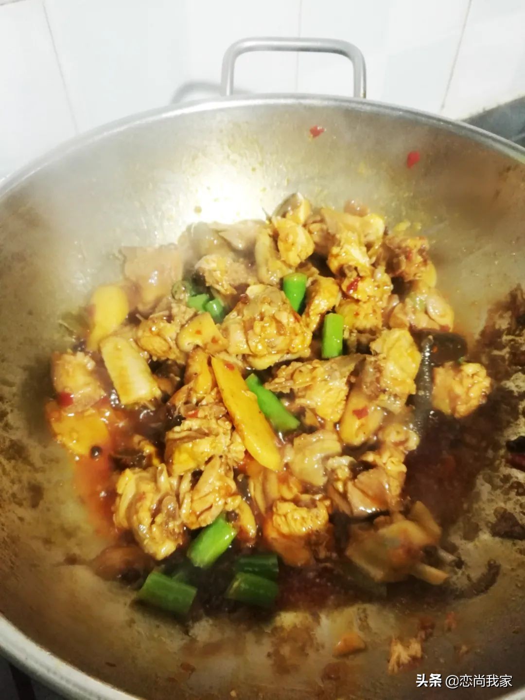 4、锅烧热,放适量油,放花椒、姜片、葱段爆香。放入鸡肉块,快速翻炒,放料酒翻炒,放盐、生抽翻炒入味。放香菇翻炒。加少量的水,和一下,盖上盖子大火烧开焖煮20分钟左右,大火焖干水分,起锅前放青段段翻炒,放胡椒粉和匀出锅。