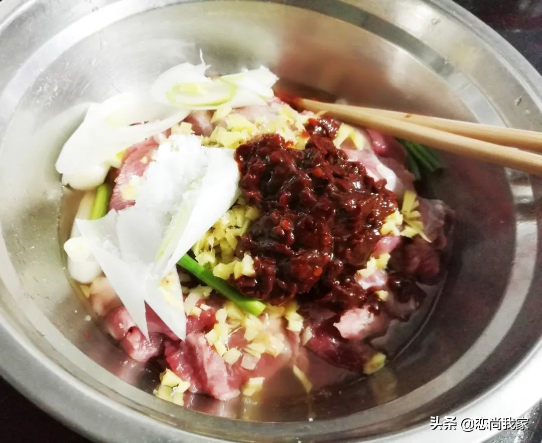 4、羊肉片中放入料酒、盐、姜片、白糖、葱段抓上酱。放入少许郫县豆瓣酱抓匀,放入芝麻香油和匀。