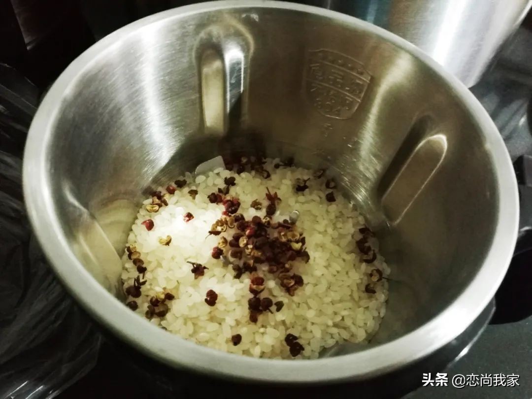 1、先准备蒸肉粉,蒸肉米粉不要太细,自己在家做可以用果汁机打一分钟即可。米粉中加入适量的花椒粒,打成米粉待用。