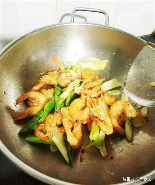 3、锅中留余油,放葱、姜片、蒜粒、辣椒小火煸香。放入爆好的虾翻炒,放芹菜,放盐调味,再放花椒粉,黑胡椒粉,白糖少许翻炒均匀即可。起锅撒上葱花。一道高大上的油爆虾就做好了。