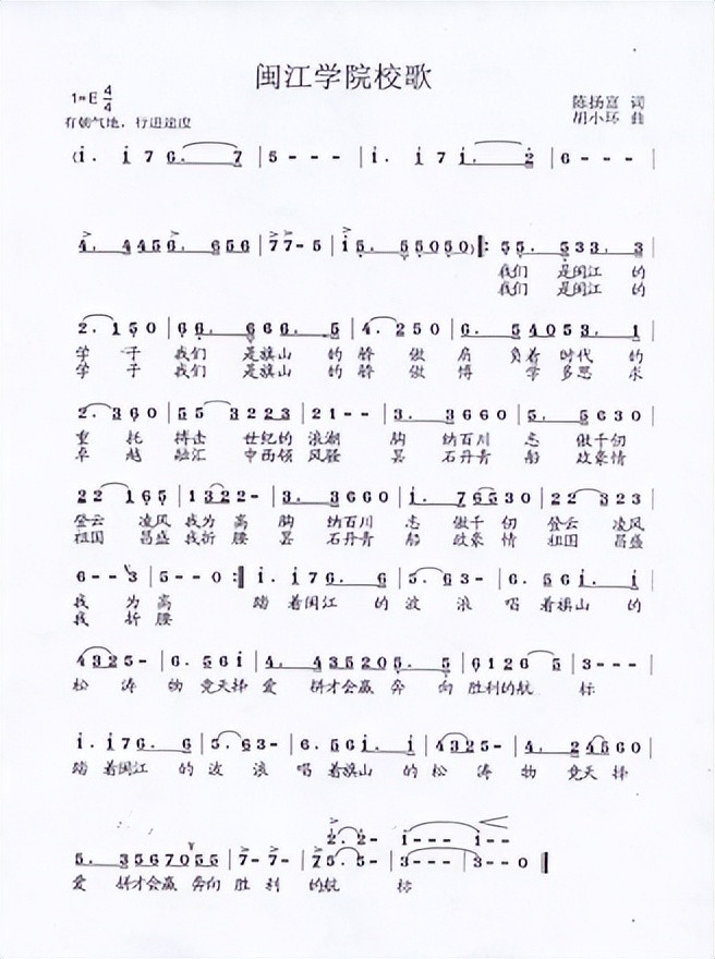 我们是闽江的学子/我们是旗山的骄傲/肩负时代的重托/搏击世纪的浪潮/胸纳百川/志傲千仞/登云凌风我为高/我们是闽江的学子/我们是旗山的骄傲/博学多思求卓越/融汇中西领/fengsao昙石丹青/船政豪情/祖国昌盛我折腰