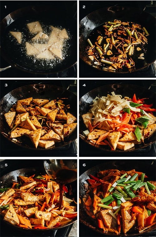 06.入油炸过的豆腐,胡萝卜、甜椒和笋,翻炒30秒-1分钟。