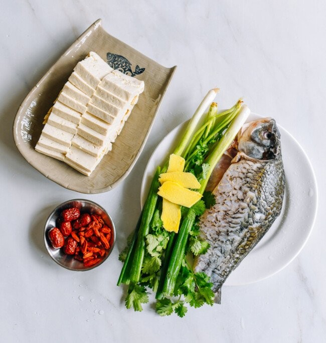 鲫鱼 1条、盐1/2小勺、姜4片、开水1.5L(大概7杯水)、黄酒2大勺、糖1/2小勺、红枣3颗、枸杞1大勺、豆腐400g(推荐嫩豆腐)、白胡椒粉1/2小勺、麻油 (可选)1/4小勺、葱花2根、香菜(可选)1大勺