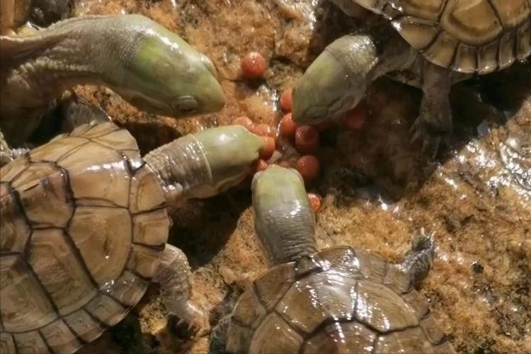 由于稚龟的消化功能较弱,应投喂精细、嫩、软、易消化且营养丰富的优质饲料,主要以小鱼、小虾或瘦猪肉为主食,再加入黄粉虫或蚕蛹。