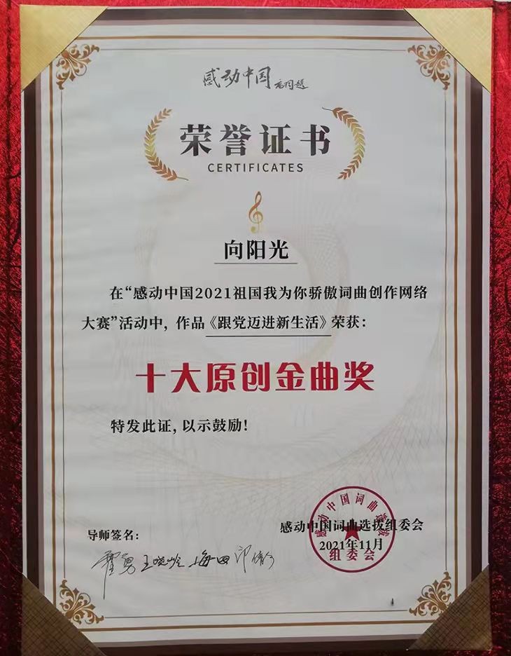 大赛组委会于2022.7.25在央视星光演播厅举行了“2022感动中国综艺盛典”,全程录像,现场直播,作品在央视的舞台上展示给了全国观众;《<跟党迈进新生活>内涵解读》等2篇音乐评论上了《湖南日报》(湘江周刊·艺风)、中宣部“学习强国”;《我的中华》《我们拥抱春天》等100余首歌曲入选《全国教师作曲家歌曲集》(上下)《中国当代优秀校园歌曲》《甜甜的歌-教坛作曲家特别专号》等10余部歌集。著有《音乐文化与素质教育》《中外音乐史学研究》《中国音教十家优秀歌曲专集》(向阳光优秀歌曲专辑)《向阳光声乐作品选》大型声乐套曲《临湘组歌》(十乐章)《五尖山之歌》(五乐章)等10余部,其中《音乐文化与素质教育》(课题专著):