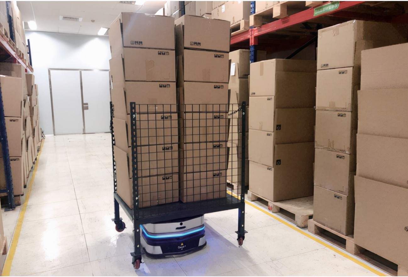 极智嘉M200C搬运机器人负责往返于产线线边运送包材