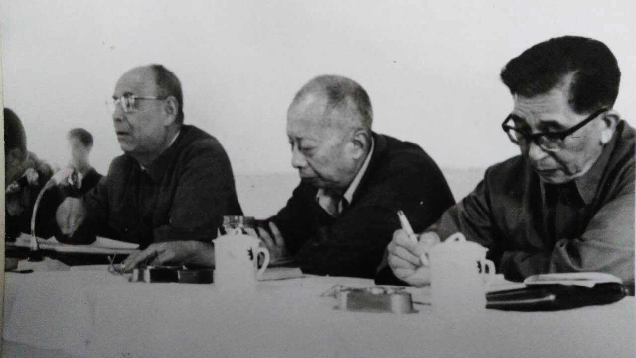 韩哲一(左一)来后方时作报告。中间是后方基地局党委书记苏博。
