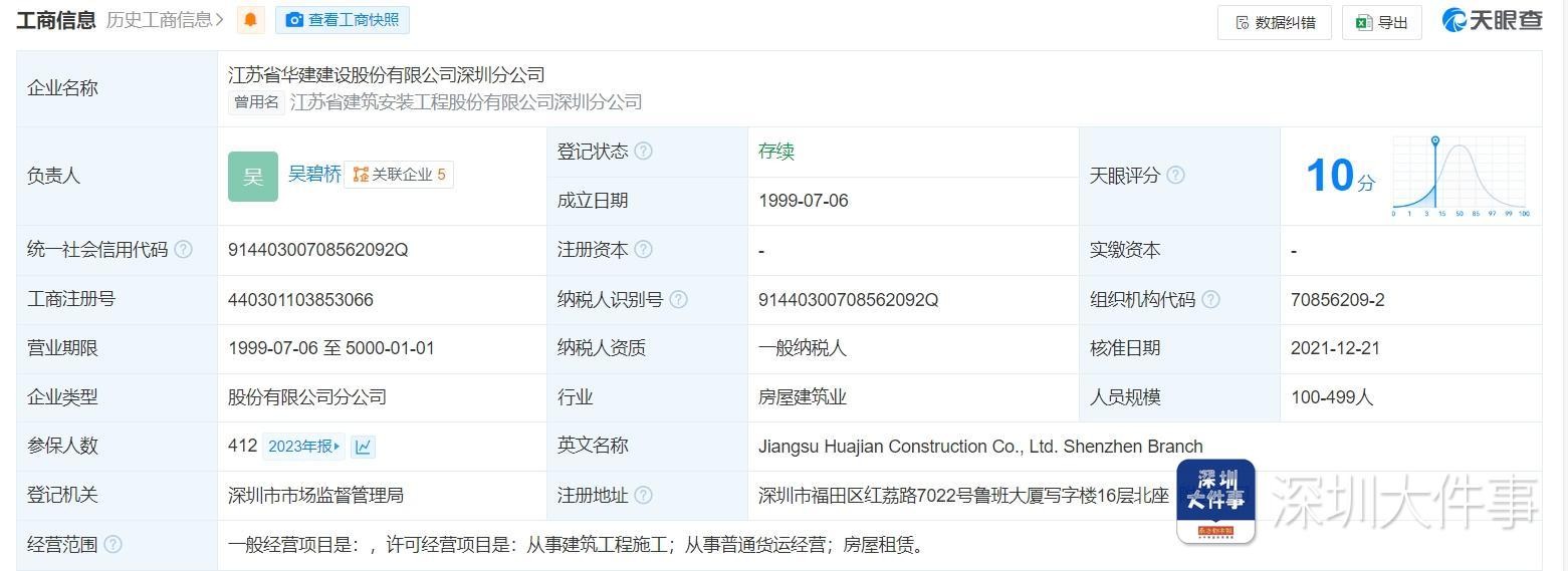 天眼查官网显示,本案当事人江苏省华建建设股份有限公司深圳分公司成立于1999年,当前注册地为深圳市福田区,曾用名江苏省建筑安装工程股份有限公司深圳分公司,许可经营项目为从事建筑工程施工、从事普通货运经营以及房屋租赁。