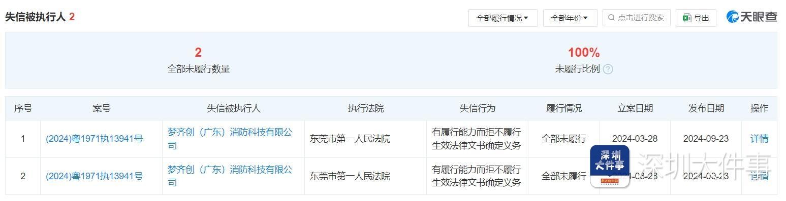 而该批次消防灭火器的生产企业梦齐创(广东)消防科技有限公司的注册地址为广东省东莞市中堂镇中麻路,经营范围包括研发、生产、加工、销售消防设备、消防器材、消防装备、消防配件、灭火剂、应急灯具及其配件、防盗门、智能家居设备;消防设施工程的设计、施工。天眼查官网显示,该企业在2024年9月23日于(2024)粤1971执13941号案中因未履行1028642元的执行标的而被列为“失信被执行人”。