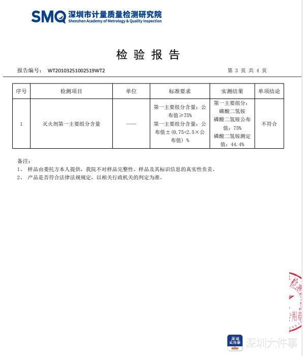 但李先生表示,业主直到1月20日才获悉,自行送检和市场监管部门送检的两份样本检验报告均显示:“灭火剂第一主要组成成分含量”的实测结果——磷酸二氢铵的测定值为44.4%,低于标准要求中的≥75%要求,该单项结论不符合标准要求。随后,业主于1月22日再次报警,公安机关亦赴现场取证,清点灭火器数量。