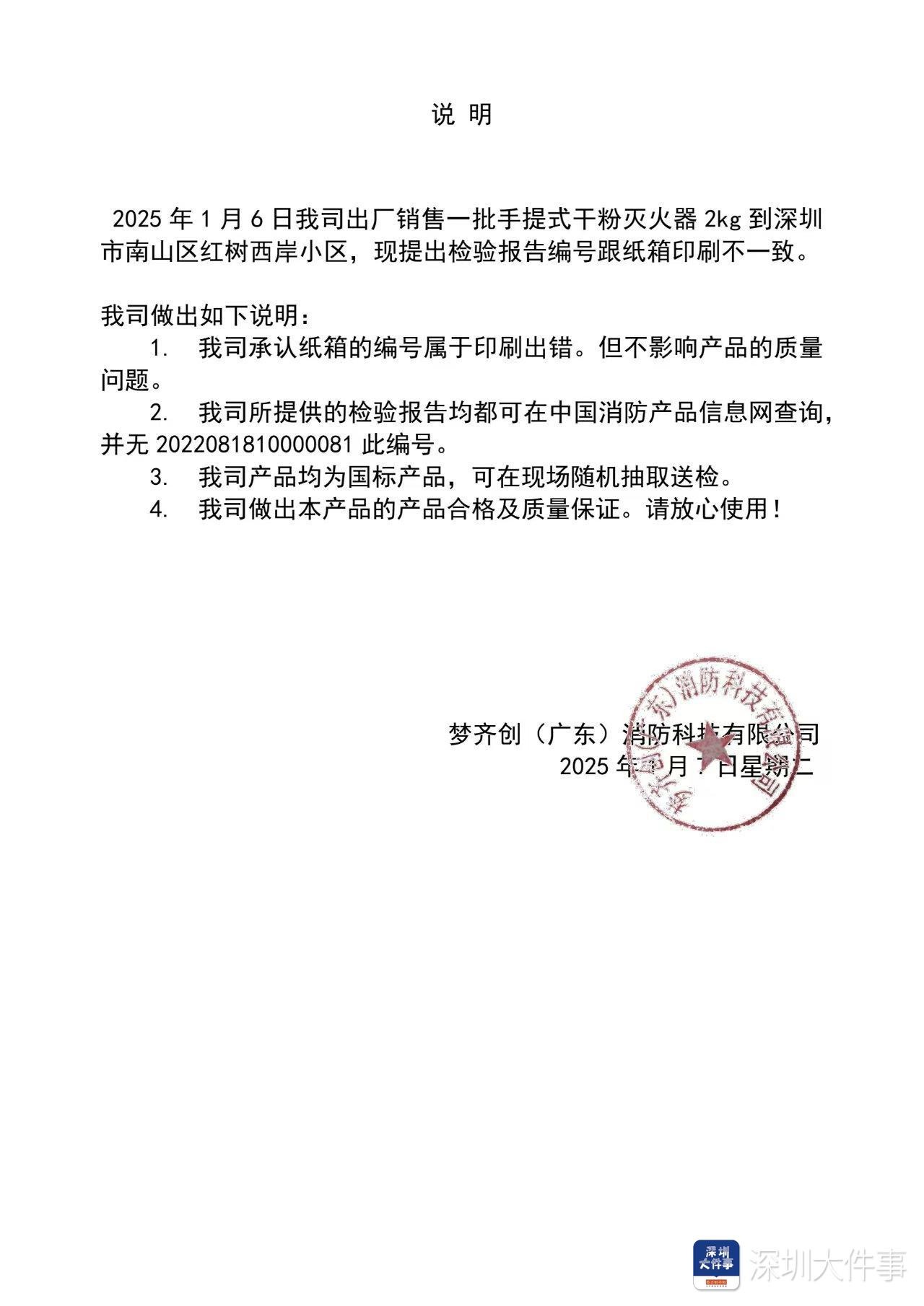 据梦齐创(广东)消防科技有限公司2025年1月7日出具的一份《说明》,该公司2025年1月6日出厂销售一批手提式干粉灭火器2kg到深圳市南山区红树西岸小区,现对检验报告编号跟纸箱印刷不一致的情况作出说明:“我司承认纸箱的编号属于印刷出错,但不影响产品的质量。”“我司所提供的检验报告均可在中国消防产品信息网查询,并无2022081810000081此编号。”“我司产品均为国标产品,可在现场随机抽取送检。”“我司做出本产品和产品合格及质量保证。”