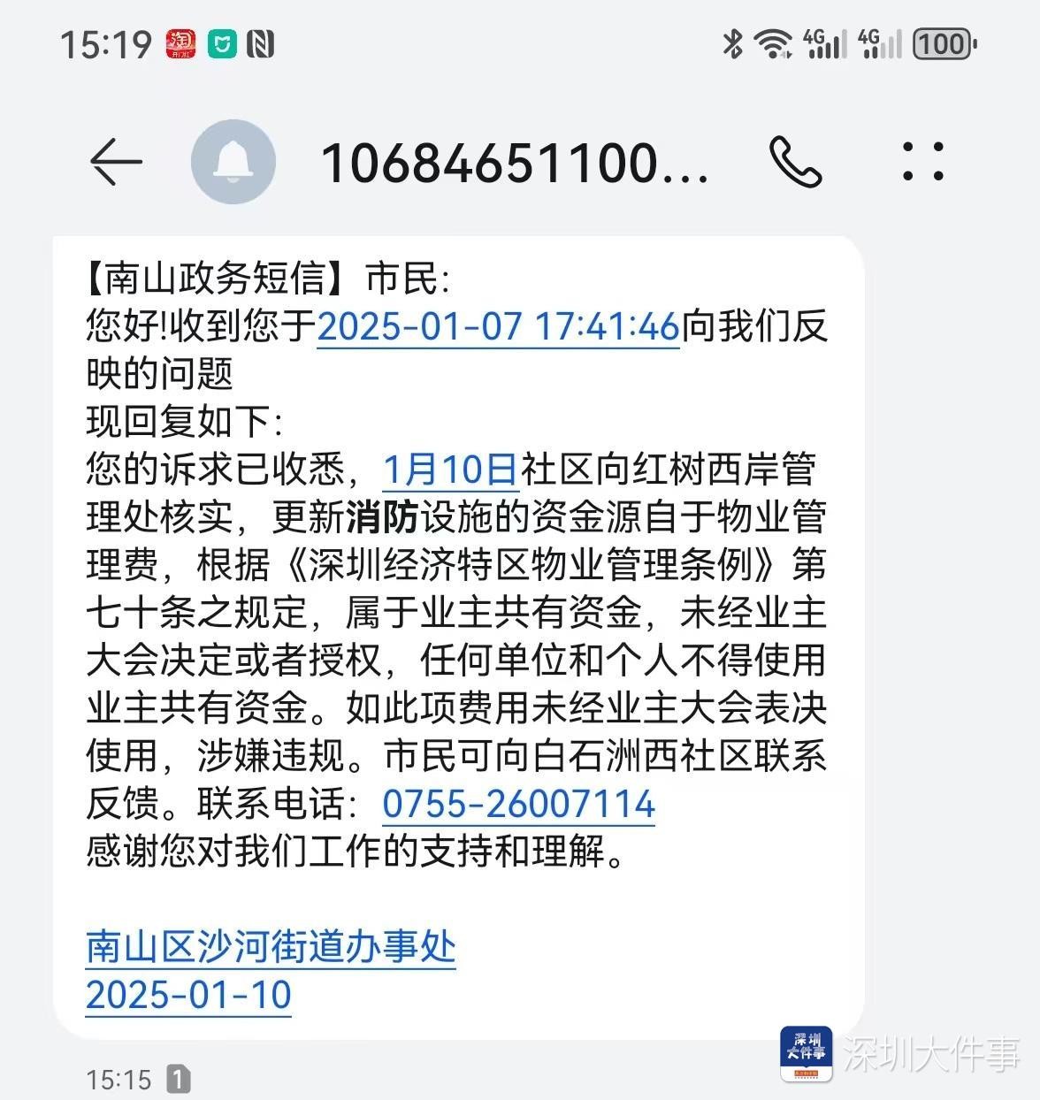 业主于1月10日收到南山区沙河街道办事处就此事的答复中提到,社区1月10日向红树西岸管理处核实,更新消防设施的资金源自于物业管理费,根据《深圳经济特区物业管理条例》第七十条之规定,属于业主共有资金,未经业主大会决定或者授权,任何单位和个人不得使用业主共有资金。如此项费用未经业主大会表决使用,涉嫌违规。市民可向白石洲西社区联系反馈。
