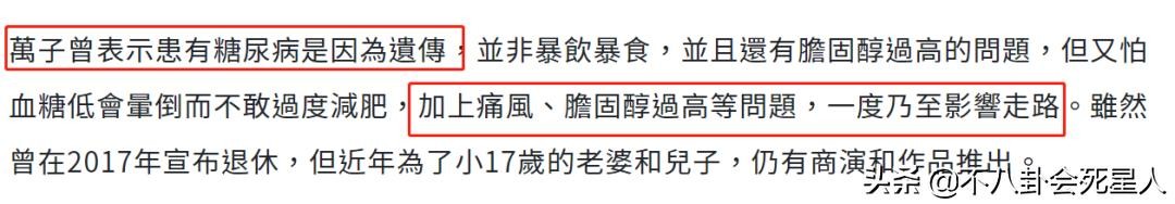 但万梓良晚年因为曾经患过糖尿病,身体状况变得很差,头发花白身材发福,面容一度很憔悴。后来虽然恢复了健康,身材也变瘦了很多,但是他看起来却苍老了很多,晚年为了才18岁的儿子,万梓良一直拼命工作,不敢退休。