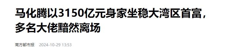 南方都市报在2024年10月29日关于《马化腾以3150亿元身家坐稳大湾区首富,多名大佬黯然离场》的报道