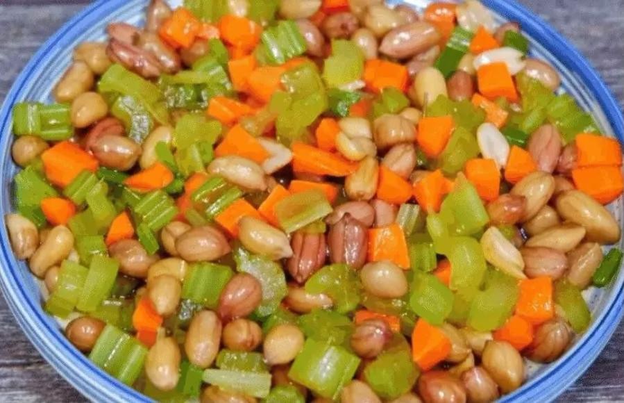 (1)花生米洗净,生姜去皮切片,胡萝卜洗净去皮切丁,芹菜洗净切丁备用。