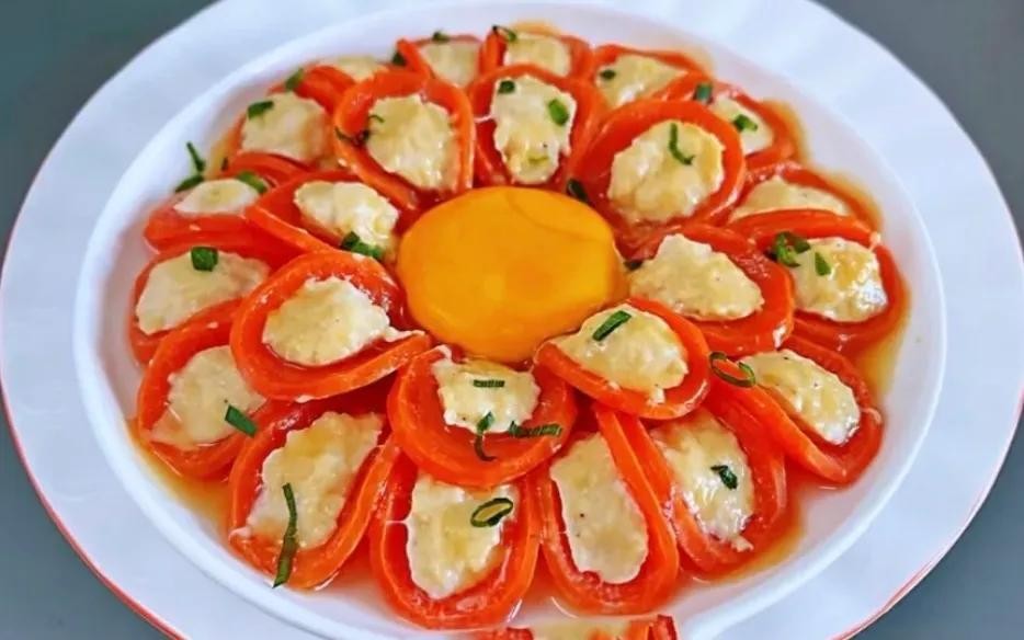 (4)将腌制好的胡萝卜片取出来冲洗一下沥干水分,放上调好的鸡肉,放入盘中摆好,中间放入蛋黄,上锅蒸五分钟即可。
