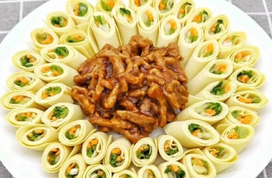 (5)豆皮铺平,摆上葱丝胡萝卜丝和香菜,卷紧后斜切摆盘即可,好吃又好看营养又健康老少皆宜!
