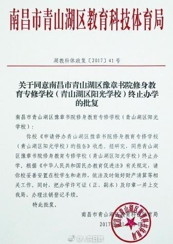 据悉,南昌市青山湖区豫章书院修身教育学校系2013年5月16日成立的民办非学历教育机构;2014年1月,经有关部门批复,增加一般不良行为青少年转化工作职能。