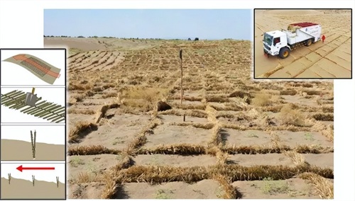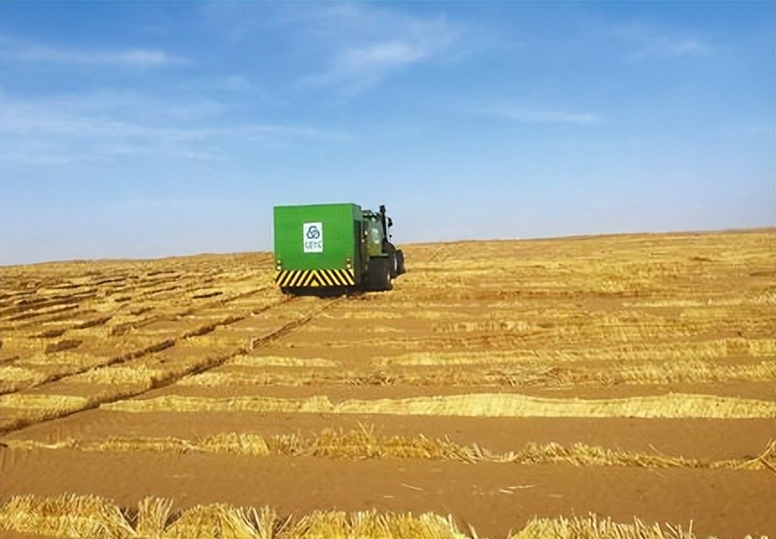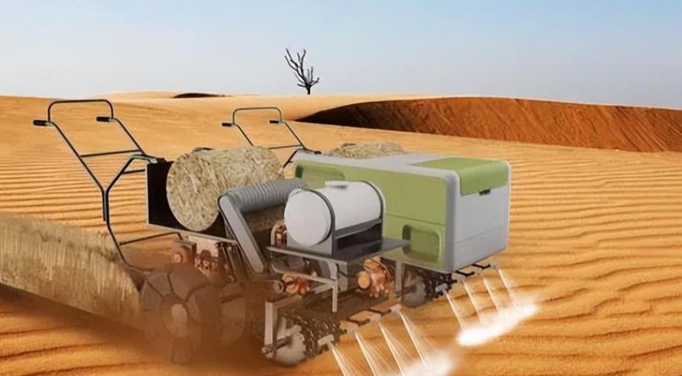 而“多功能立体固沙车”会将草料精准的铺设到对应的位置,并且深度可以达到二三十厘米。