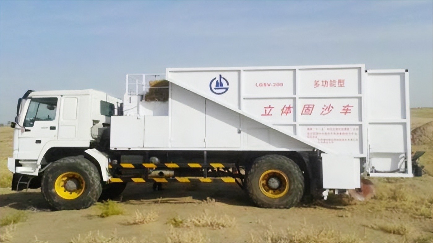 “多功能立体固沙车”长二十米,重五十吨。将铺设的原料,都放在专门的草料箱里,随后通过横、纵向输草的方式,将草料箱里的原料,分别传输到设定好的位置。快速铺设草方格沙障,播种种子,修建枯木等多个作用。