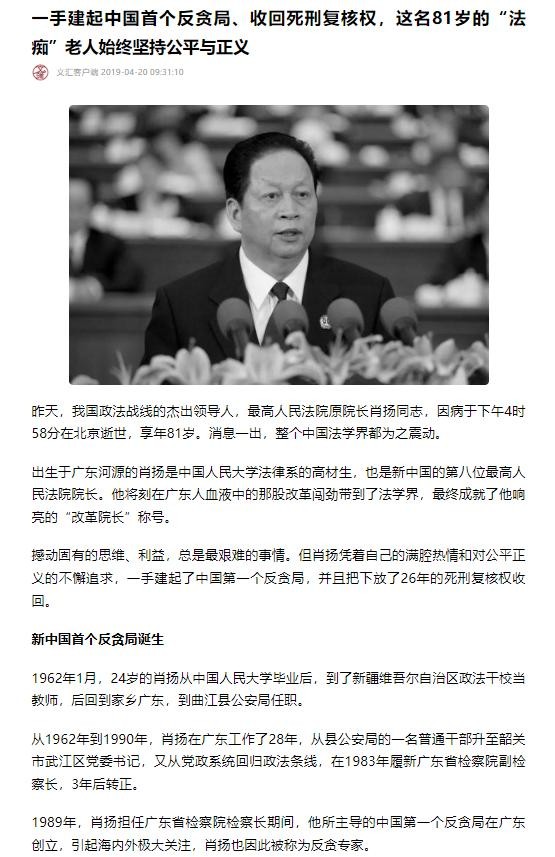 中国法院网在2019年4月20日《追忆最高法原院长肖扬:有魄力的司法改革家》的报道