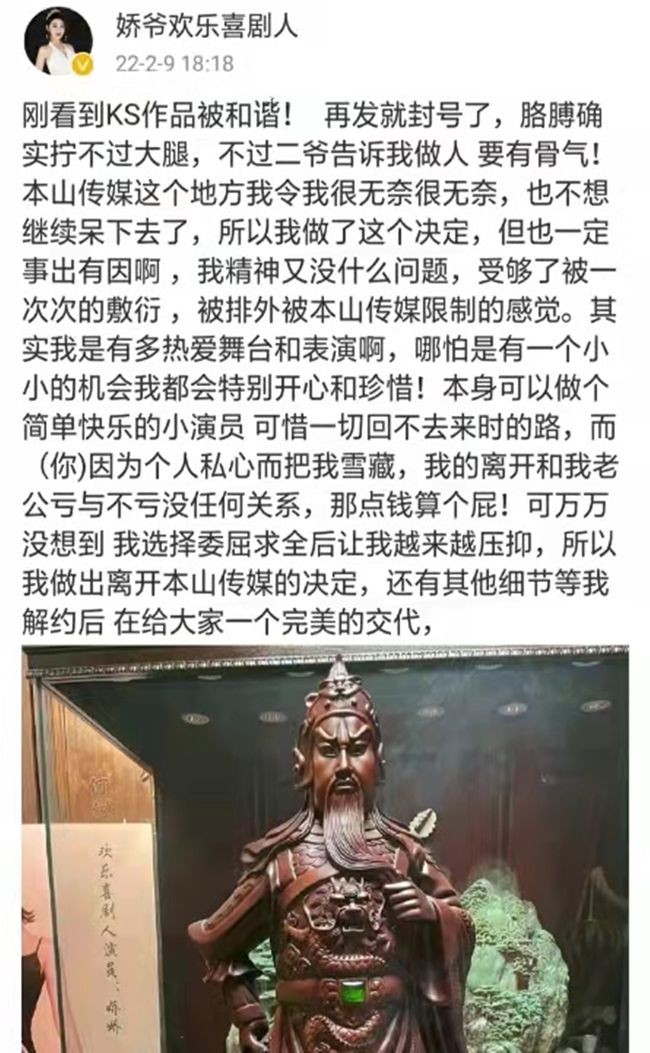 2月9日,娇娇的态度再度“由弱变强”。她在个人社交平台上发文,并附上了一张关二爷的照片。