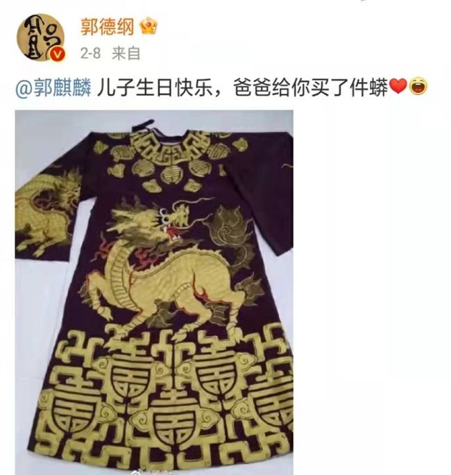 2月8日,郭德纲在社交平台上,晒出了送给郭麒麟的蟒服照片。