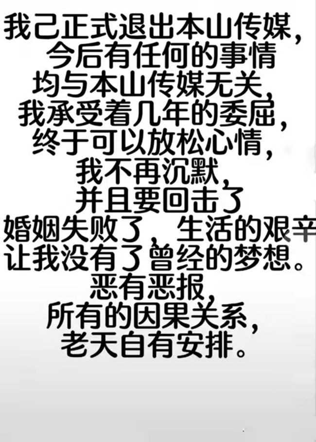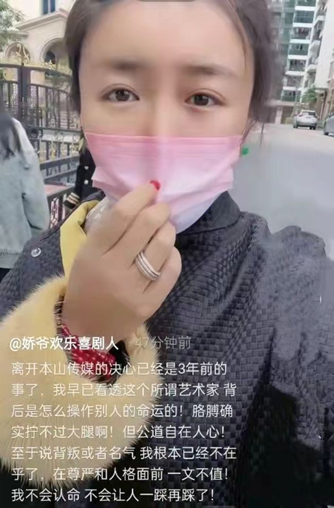 随后,娇娇还称做出这个决定,一定事出有因 ,自己精神又没问题,已经受够了被一次次敷衍 ,被排外、被限制的感觉。娇娇还说“(你)因为个人私心而把我雪藏,我的离开和我老公亏与不亏没任何关系,那点钱算个屁!”、“我选择委曲求全后让我越来越压抑,所以我做出离开本山传媒的决定,还有其他细节等我解约后,再给大家一个完美的交代。”