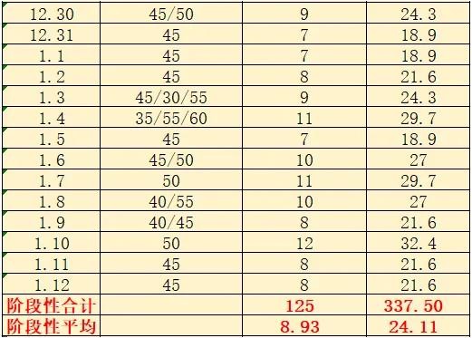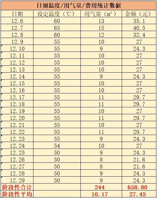 大家继续仔细看表格,其中2020.12.6日~2020.12.29日(合计采暖天数24天),我父亲设定的采暖炉温度大部分时间为55℃,少数几天设定为60℃和50℃,最终24天的阶段性数据平均值为:日用气量10.17立方,日别取暖费27.45元。