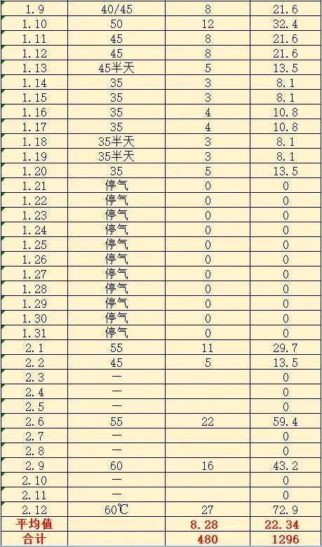 在统计采暖期间:2020.12.6日~2021.2.12日(合计:69天,期间停气:11天,实际采暖时间:58天)总用气量≈480立方,总费用≈1296元,日平均用气≈8.28立方,日平均费用≈22.34元