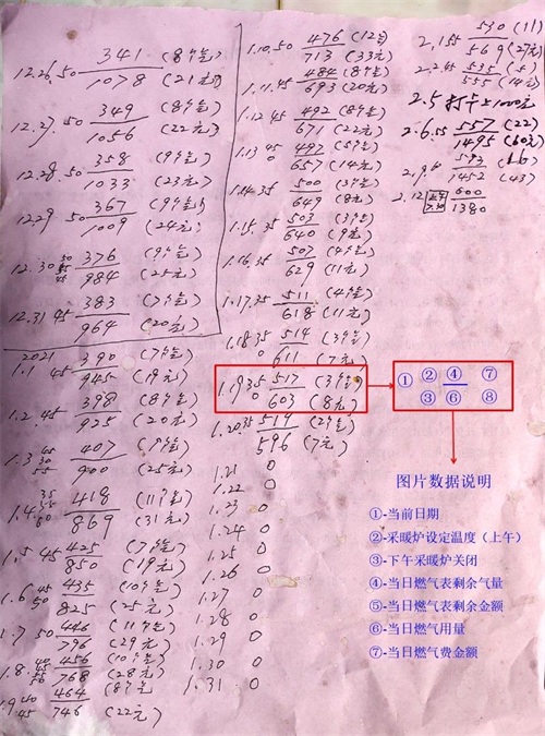 好了,前面啰嗦了半天,顺便记录了我们回老家过春节的历程,下面咱们言归正传,开始进入文章的正题:来说一说农村使用天然气,到底合适不合适?是利大于弊,还是弊大于利?具体每年甚至每天需要多少钱的取暖费?各位看官且听我细细道来。先说一说,为什么我会有此冲动想要写点关于农村煤改气的费用这一块呢,其实我现在即没生活在农村,也没时间过多关注煤改气的费用,原因还是因为今年春节回老家偶然间看到的老父亲每天手写的天然气用量记录。两篇纸密密麻麻的写满了数字,详细记录了我家从开始使用天然气取暖第一天,到我们回家后几天的具体数据。数据包括记录的起止日期、每天采暖炉的设定温度、每日的用气量及每日的费用等。