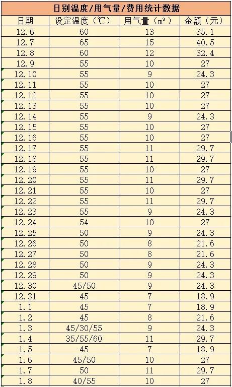 而2020.12.30日~2021.1.12日(合计采暖天数14天)期间内,为了测试温度与用气量之间的规律,父亲将采暖炉温度从30℃~60℃手动调整,有时候一天温度保持45℃不变,有时候一天内温度调整2~3次,只为变换温度参数从而获得更加准确的测试结果(此处向老爸投以敬佩的目光)。通过表格可以看到,此采暖期间内,45℃是一个主要数据,最终计算得出该阶段采暖期间内平均值:日用气量8.93立方,日采暖费用24.11元