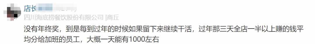 海底捞员工原话:有,一个月80,年前发,最普通每个月80,年终奖根据你上班月数算。有比没有好多了,一般春节前发。春节营业会把营业额的百分之60分给员工,两天大约2000吧